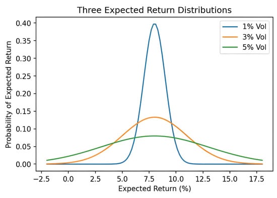 The bell-shaped curve posits that future returns closer to the expected return are more likely than those further toward the tail ends. As volatility  increases, however, future returns away from the 8% mark increase in likelihood. Thus, the asset with 5% volatility is the riskiest of the three. In reality, however, one will find that the expected return increases with volatility.