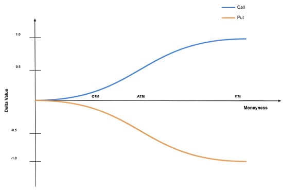 Since hedging is of extreme importance to market participants, they have coined terms that express the underlying’s current price relative to the option’s strike price. An option is said to be ‘out of the money’ (OTM) if an expiration today will yield the contract worthless. Furthermore, an option is ‘in the money’ (ITM) if an expiration today will yield a positive payoff. Finally, an option is ‘at the money’ (ATM) if its strike price is the same as the current price of the underlying. Figure 6 presents how the delta value () of a call or a put varies with the moneyness of an option with respect to its strike. All most all options are issued with a strike close to the current price of the underlying.