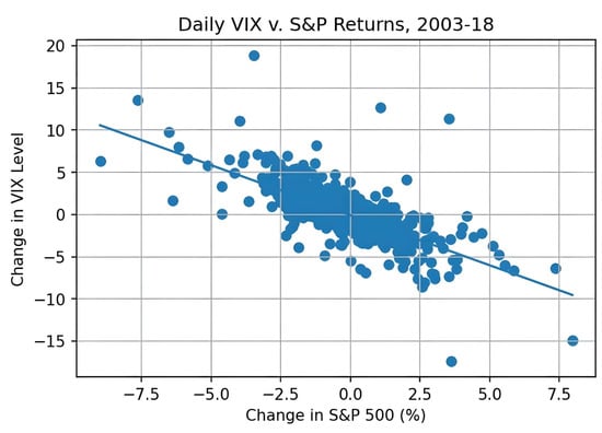Historically, the correlation between daily returns of the S&P 500 index and daily changes in the VIX is around , see   (). Figure 8 illustrates the negative relationship, leading up to and including Volmageddon.