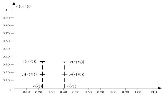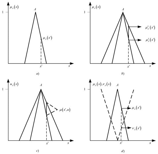 As follows from expression (7) and Figure 2a, in the original theory of fuzzy sets, uncertainties are associated only with the membership of some entities to the corresponding fuzzy set (or to the corresponding fuzzy sets). The uncertainties of interest to us are uniquely modeled and evaluated using the corresponding values of the membership function.