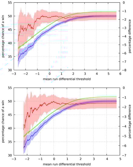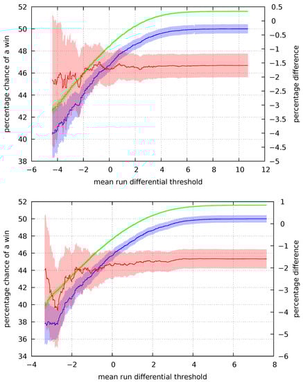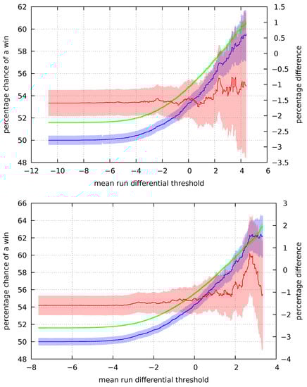 For each value of the mean run differential appearing in our data, we select a threshold equal to this value and then construct two sets using this threshold. The first set comprises games with and the second set comprises games with . Then we calculate the averages and confidence intervals of