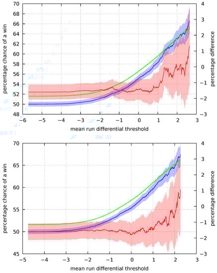 Plots of f and u for are shown in Figure 1 and Figure 2. When the mean run differential is sufficiently small, it is calculated over essentially all of the games. In this case, the implied probability is consistently below the actual probability. This is indicative of the money lines being close to the true probability and the bookmaker offering odds to ensure a profit.
