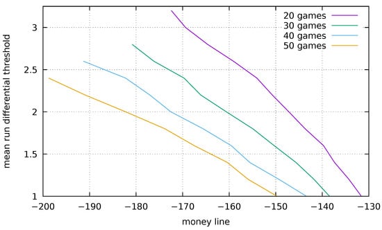 Percentages on the x-axis are expressed as a money line, which is calculated using (1). Unfortunately, money line data are not available for this period. Because does not appear to produce the prospect theory effect (see Figure 1) and does not produce sufficient observations for the desired confidence interval, we use , 30, 40, and 50 to illuminate the relationship between mean run differential and the money line.