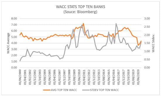 Altogether, the results with regard to the WACC are surprising, as supporters of regulation have argued, cheap capital and excessive leverage encouraged risky trading activity producing moral hazard and hence warranted increasing. The results are also surprising because the banks themselves have generally argued that new regulations would increase their cost of capital, reduce profitability and hurt the economy. In reality, we see that the WACC has hardly changed and indeed, for the largest institutions, is now lower, raising the question if regulations have “failed” or whether financial institutions have adjusted their businesses to an unaltered cost of capital—Hypothesis 2. Following the 2007–2008 Financial Crisis when rates fell, as shown in Figure 3 above, the WACC actually increased. The data at least do not support the claim that greater regulation would increase the cost of capital, aligning it with unchanged risks of bank trading, as policy makers aspired. For two-thirds of the banks in Table 4, the WACC of 2021 is lower than that of 2000. While we cannot claim that banking activities have become less risky, we can observe that along with reduced gearing and lower returns on equity, the cost of capital has fallen. As shown in Table 3, from the transition period of Basel II to Basel III, beta fell as well. Altogether, banking appears to have become less risky and less profitable, adjusting its activities to a largely unchanged cost of capital.