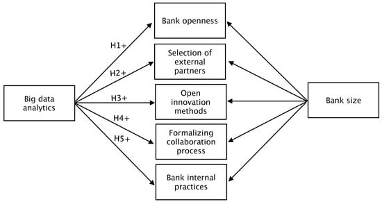 Past research on firms practicing OI using BDA has highlighted that proactive participation in OI powered by BDA allows firms to interact with various organizations and professionals (). From a banking perspective, this will help banks to create and monetize digital services, reduce costs, improve user experience, enhance business value, accelerate digital transformation, and place banks in an innovation position (). Particularly, banks may follow the mechanisms of large firms to use BDA as an innovation fuel for strategic decision making for creating Fintech(ization), establishing state-of-the-art technology, and strengthening their mutual networks (). There are several data-driven organizations such as Tesla, AT&T, Cisco, and Linux that have benefited in the past from BDA to foster OI for building new products and services and offering a unique customer experience (). Contextualizing this to the banks (primarily described as data-driven entities) should consider leveraging BDA to accelerate OI for forecasting sales, planning and designing data-driven operations, creating new and innovative business models, and rectifying governance issues.