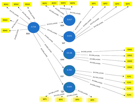 The explanatory power of our theoretical model was further examined by analyzing the explained variance (R2) of endogenous variables. It is consistent with the PLS objective to use R2 for assessing the structural model as it helps in maximizing the variance explained in endogenous variables (). The values of R2 for BOP (0.617), SEP (0.674), OIM (0.542), FCP (0.783), and BIP (0.508) were moderately strong. The effect size of variance in each variable remains unexplored in the endogenous latent variables and can be evaluated by Cohen’s f2 formula. To estimate the effect size, we used ’s () approach by considering large (0.35), medium (0.15), and small (0.02) values as thresholds to investigate the effect size of BDA on our endogenous variables. The results of f2 (effect sizes) for BDA effect on BOP (0.628), SEP (0.697), and FCP (0.791) were considered large, whereas for IOM (0.049) and BIP (0.032), BDA had a medium-sized effect. We also estimated the predictability of our model using Stone–Geisser’s Q2 method and found that all our endogenous variables had an acceptable predictive relevance as the values of Q2 were greater than zero (; ). The results of R2, f2, and Q2 are reported in Table 9.