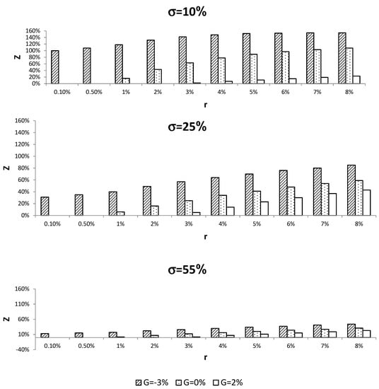 We exemplify the sensitivity analysis of Z as a function of market conditions for three types of pension members that buy the SP. (1) A relatively risk-loving pension member, who wants to invest in the capital market and, in return, to set a floor value of 97% of their portfolio value (G = −3%); (2) an average pension member, who wants to invest in the capital market in return for hedging his cumulative pension savings (G = 0%); and (3) a pension member who wants to assure a minimal return of G = 2% in return for a smaller exposure to the capital market.