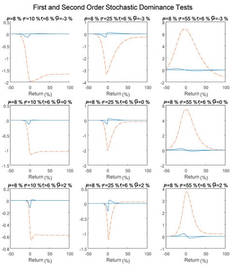 Figure 2 also shows that no second-order dominance exists when the SP guarantees a G = 2% return. However, when market risk is high, = 55%, Figure 2 demonstrates that the difference of the CDF is positive, suggesting that the investment portfolio has second-order stochastic dominance over the SP. Nevertheless, such a large standard deviation is usually typical of a crisis in the equity market. Therefore, at such a time, the prices of options on the market will probably be so high as to stop the issuance of these SPs or, at least, make them much less attractive until the market regains a higher degree of stability.