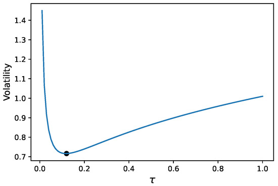 Volatility curve of a noisy fractional Brownian motion with . The minimal volatility is marked with a black dot.