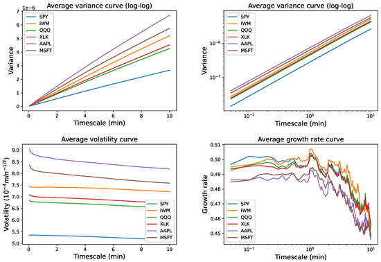 Average variance, volatility, and growth rate curves estimated on the 3 s intraday dataset. For the intraday time series on each day, one variance curve is estimated for each asset using Equation (