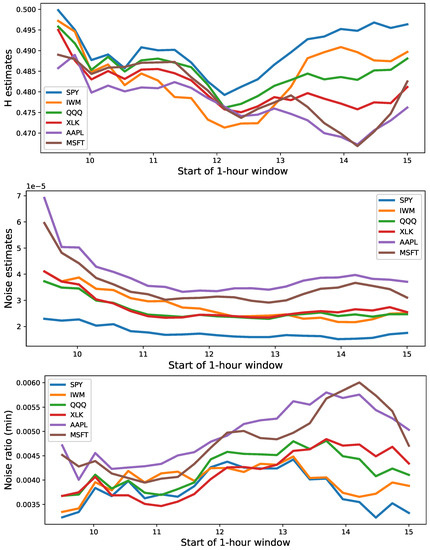 Hurst exponent, H, noise level, , and noise ratio, , on a 1 hour rolling window. The x-axis marks the time of the day (e.g., 10 = 10 a.m. EST and 13 = 1 p.m. EST). The starting point of the window shifts on a 15 min basis. For each day, one rolling Hurst curve is estimated for each asset. The plot shows the average over all dates in the dataset.