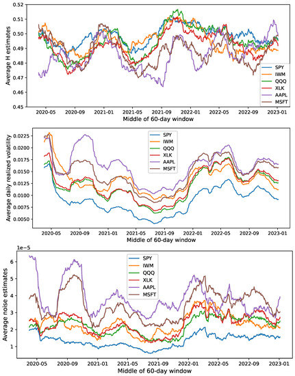 Time series of the Hurst exponent, realized volatility, and noise from 2020 to 2023. Values are estimated from intraday data sampled every 3 s for each ticker and averaged over 60-day rolling windows.