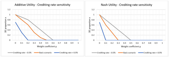 To check the sensitivity of the crediting interest rate on the optimal choice of the plan and depending on the bargaining power, we increase and decrease by . The results are presented in Figure 2.