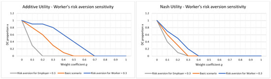In this section, we focus on the impact of the risk aversion parameters and on the optimal choice of pension plans. In this respect, we first increase the risk aversion of the employer, , from to to compare its effect to the basic scenario, and then, analogously, we increase the risk aversion of the worker, , from to , which makes the worker more risk-averse than the employer.