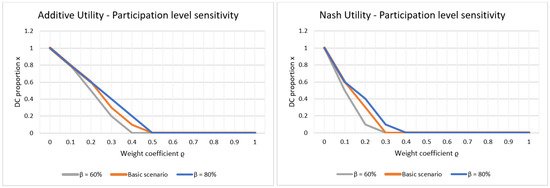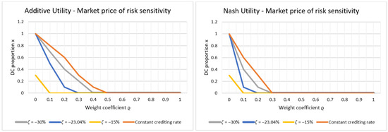 We observe that as the participation level beta increases (decreases), the minimum guaranteed interest rate granted by the insurer decreases (increases). Consequently, when the contract is priced fairly, the return on the participating fund remains relatively consistent. This leads to the worker’s continued attraction towards the DC-PL plan, resulting in the same optimal outcome for values between 0 and 0.2 in the additive utility model, compared to the basic scenario (see Figure 5). However, as the bargaining power increases, there is a corresponding increase in interest towards the DC-PL plan when there is higher participation in the insurer’s profits, and vice versa. It is worth noting that the impact remains largely unchanged whether we utilize additive or Nash utility models in our analysis.