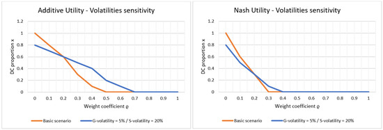 To check the sensitivity of the volatilities of the funds G and S on the optimal utility results under different bargaining power levels, we increase the G-volatility from to and the S-volatility from to . The increase in the G-volatility leads to a decrease in the fair guaranteed interest rate , which is now , and consequently an increase in the surplus return, which intuitively makes the DC-PL plan less attractive but also more preferable to the worker than the CB-UL plan, as proved in Figure 6. On the other hand, the increase in the return of the risky asset and in the surplus return in the participating contract keeps the optimal investment decision in the DC-PL plan longer between and in the additive utility model before it converges to the CB-UL plan. Conversely, in the Nash equilibrium model, the change in the volatilities has no impact on the optimal results for .