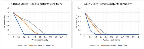 We point out that when the maturity of the contract decreases, the minimum guaranteed interest rate in the participating life insurance contract decreases. This should make the DC-PL plan less attractive to the worker, as they can earn a higher return with the CB plan. Interestingly, with the participation in the insurer’s profits, the DC-PL plan stays more attractive to the worker for all maturity T, as eventually the return on the participating fund is higher than the return on the CB fund. At the same time, with a lower time to maturity, the return on the risky fund S decreases, which makes the CB-UL plan less attractive to the employer. Therefore, we see in Figure 7 that the DC-PL plan is more appreciated for a lower T, and vice versa. On the other hand, with a sharing of power between the worker and the employer, both parties’ optimal decisions are more focused on the CB-UL plan. This is because, from one side, the crediting interest rate is higher and more interesting for the worker, and from the other side, the return from the unit-linked contract is higher and potentially more profitable for the employer.