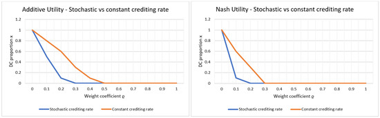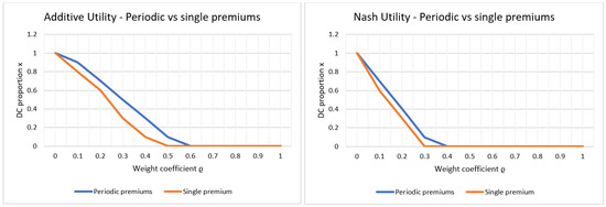 Figure 4 proves that the increase of leads to the worker’s unwillingness to take risks and therefore increases their preference for the DC-PL plan. Moreover, we observe in the additive utility model that for an equal weight between the two parties, the optimal decision is to invest in the DC-PL plan. Similarly, the increase in the employer’s risk aversion speeds up the convergence to the CB-UL plan. Interestingly, the impact is more pronounced in the additive utility than in the Nash utility model.