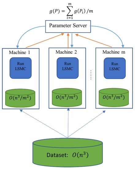 The idea of distributed LSMC is illustrated in Figure 2. The entire dataset P is partitioned into m subsets (usually of equal size), and these subsets are labeled as and then distributed to each machine. The parameter server collects the estimated option price obtained by machine i from the subset, , and then the parameter server computes their average value , which yields the final estimated option price.