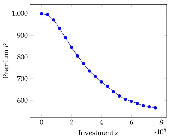 where v is again the vulnerability, is the basis premium rate, that is, the premium for the case of full vulnerability () in the absence of investments, and r is the discount rate that modulates how the reduction in vulnerability is transferred to the premium. Naturally, the results obtained in our analysis are constrained by the choice of the insurance premium function and the type of insurance coverage selected (in this case, full loss coverage). In Figure 2, the premium P is represented as a function of the investment z.