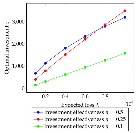 In Figure 6, we can observe the trend in the optimal investment in security z as a function of the expected loss . In particular, we can see that the optimal investment assumes a different behavior, varying the investment effectiveness coefficient when the expected loss grows. When the coefficient is equal to , the trend in the investment is quite linear; instead, in the other two cases ( and ), it assumes a sublinear fashion. From Figure 6, it is important to underline the role of the investment effectiveness coefficient; variations of this coefficient produce non-linear variations in the optimal investment in security. The interesting thing to note is that if investment efficiency is high, for moderately high loss ratios, there is a preference to invest more in security to obtain a reduced insurance premium. However, for higher expected loss values , if the coefficient of security investment efficiency is not too low, there is a preference to invest more in security to avoid a significant expense required by the insurance premium.