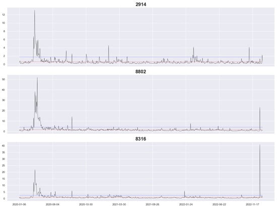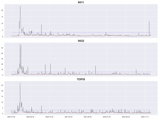 Figure 1 and Figure 2 depict the RV of our datasets, with the vertical coordinate being the RV and the horizontal coordinate being the date, where the blue and red lines represent the 95% quantile value and the average value, respectively. The graphs reveal that all datasets reached a high level at the beginning of the coronavirus pandemic, with long periods exceeding the 95% quantile value. Among them, 8802, 8316, and 8411 reached a high level at the end of 2022 again but not as high as at the beginning of the coronavirus pandemic, and the extreme RV value of 8316 occurred at the end of 2022. Furthermore, 8802, 8316, 8411, and TOPIX had a high level of RV at the end of the other periods, and they all had relatively stable levels of RV during the other periods, whereas 2914 and 9432 had a few higher peaks.