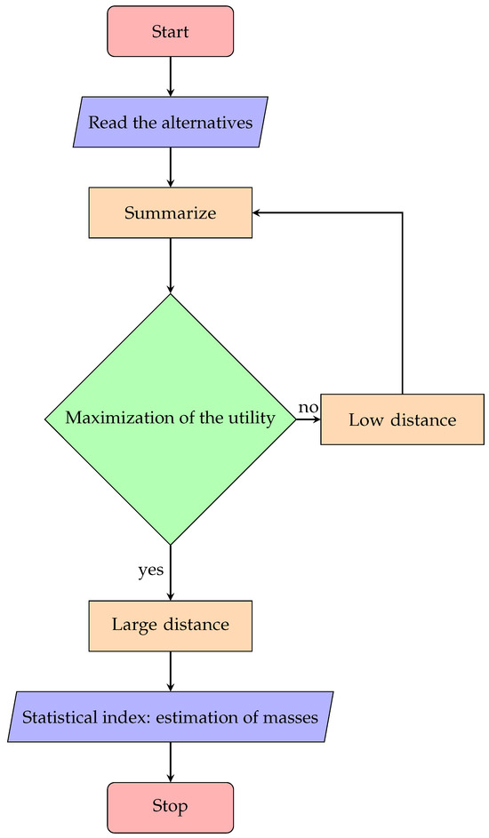 This triangle contains all fair estimations being made by a given individual. Given and , it is possible to estimate the joint masses identifying in such a way that one out of three values, , 0, and 1, associated with the correlation coefficient appears (it is usually ). The correlation coefficient is equal to the covariance between and divided by the product of their standard deviations. With respect to the correlation coefficient, the possible values for and are deviations. Nevertheless, all masses underlying every point denoted by (37) do not change. If is the value being taken by the correlation coefficient, then a given individual making a specific estimation of joint masses inside his or her budget set is a risk averter; if 0 is the value being taken, then an individual is risk neutral. If the correlation coefficient is equal to 1, then a given decision maker is a risk lover. The right triangle where all fair estimations appear is determined by a straight line, whose slope is negative. This line is a hyperplane. Its horizontal and vertical intercepts are established. From the ratio of these intercepts, it is possible to estimate the ratio of the prices of the two marginal random goods. The space where all fair estimations appear is endowed with boundary points. It is a subset of a linear space over . It is also possible to choose a specific point maximizing the subjective utility related to objects of decision maker estimation. This choice always depends on empirical aspects. Thus, it is essential to distinguish two phases: a formal and an empirical phase. The formal phase firstly establishes all fair estimations, whereas the empirical one secondly identifies a specific point belonging to the right triangle. The hyperplane never separates this specific point from all points expressing possible alternatives. In other words, the hyperplane under consideration leaves this specific point on the same side together with all points expressing possible alternatives. Applying the Pythagorean theorem to the points of the right triangle, it is possible to prove that the notion of ordinal utility is a distance. If and are the components of multiple goods of order 2 denoted by , then bivariate distributions of mass have to be considered. This is because it is possible to exchange for and for . This implies that it is necessary to exchange for . The expected return on , where is a portfolio containing two financial assets, is denoted by . The latter index contains bivariate distributions of mass, which are all summarized. This result is innovative. By considering more than two marginal random goods, similar indices are obtained. What is observed inside the right triangle can be used to handle the notion of expected utility (cardinal utility) outside it. Hence, choice problems related to financial assets that are studied under uncertainty and riskiness outside the budget set of a given decision maker depend on the structure of the expected utility function describing an individual’s specific attitude toward risk. This expected utility function is treated inside a subset of a linear space over . The notion of cardinal utility is based on a distance too. It is of interest to take the following Figure 1 as a guide.