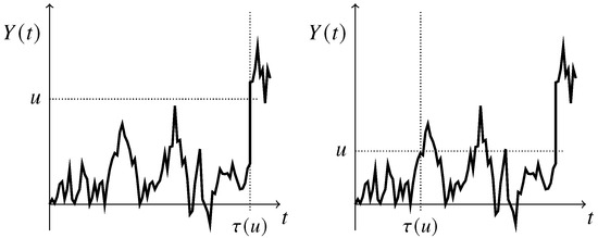 To parse this decomposition, first note that the first term on the right-hand side corresponds to the scenario that exceeds u for the first time at (i.e., ), and the second term to the scenario that u is not yet exceeded by at time (i.e., ). In this reasoning we use that for all , implying that cannot occur. We refer to Figure 2 for an illustration of both possible scenarios. Then the right-hand side of (14) follows by the following observations: