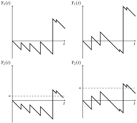 Quantities of interest—The Gerber–Shiu metrics provide insight into the two individual reserve level processes at ruin. Concretely, with and , the focus lies on capturing a probabilistic description of the joint distribution of the random vectors