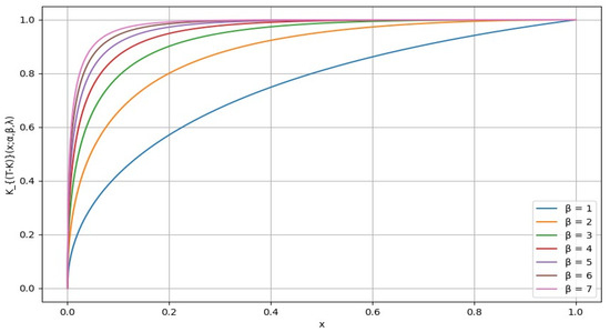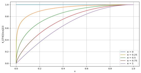 Figure 2 shows a plot of the distribution for different values of parameter {0, 0.25, 0.5,0.75, 1}, while fixing and at 1. From the graph, we can observe that the value of decreases, the curve becomes steeper, and this indicates that the distribution becomes more concentrated around a specific higher peak value. On the other hand, as the value of increases, the curve becomes flatter and wider, indicating a more spread-out distribution. Parameter controls the rate of convergence. It appears that the choice of a smaller value reflects a higher level of global risk-tolerant attitude.