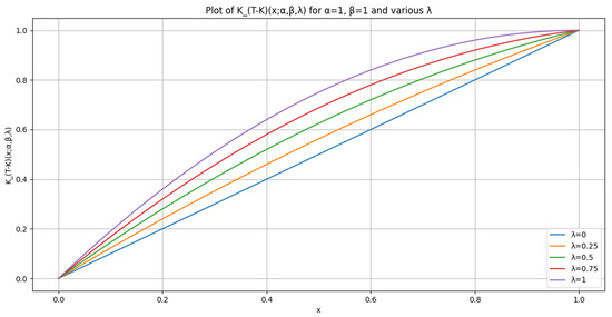 For the area under a concave curve to be 0.5 (equivalent to the area under the diagonal line), the curve would have to coincide with this diagonal line from (0,0) to (1,1) over the entire interval [0, 1]. In the transmuted Kumaraswamy distortion function, when the function coincides with the diagonal line, this suggests that there is no distortion of probabilities. This implies that the perceived probabilities align perfectly with the true probabilities. For the transmuted Kumaraswamy distortion function to coincide with the diagonal line (indicating no distortion), it would require and , as shown in Figure 3.