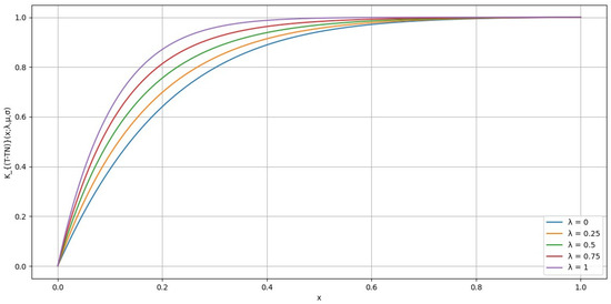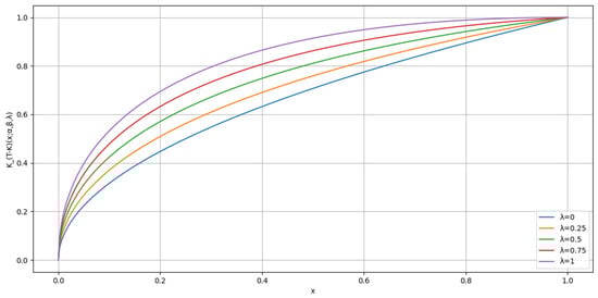 Figure 4 illustrates the distortion for different values of the parameter {0, 0.25, 0.5, 0.75, 1} with fixed at 1 and fixed at 0.5. From the graph, it is evident that as the value of λ increases, the curve becomes steeper. This steepness indicates that the distribution is more concentrated around a higher peak value, suggesting a higher level of risk aversion. Conversely, when λ is smaller, the curve becomes flatter and more spread out, indicating a more even distribution of values. Thus, a higher λ reflects a distribution that is more sharply peaked, implying a higher level of global risk-tolerant attitude.