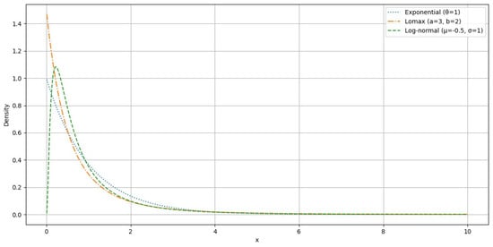 PDF of exponential, Lomax, and log-normal losses.