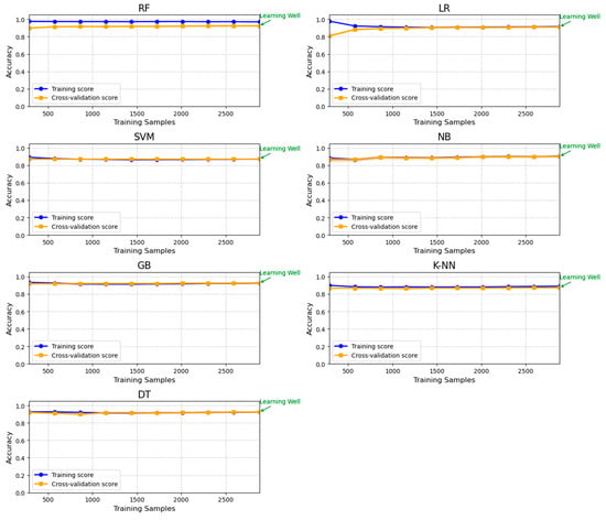 The Figure 2 below shows the learning curves of different classifiers to evaluate the performance of the classifiers in the training and cross-validation. The intention is to visually diagnose if the model overfits, underfits, or performs well over time during the learning experience. Additionally, the cross-validation ensures that classifiers’ performance is robust and the learning curves are reliable. The learning curve for the training error is higher than that of cross-validation, with most classification models around 90% average accuracy in the train scores, which indicates that the models do not overfit and thus can generalise well in the test data. The lift curve performs well for all the classifiers because the training score and validation score accuracy are close to each other. Even though K-NN is the least performing classifier compared to others, the classifier shows a consistent trend and performs as observed in Figure 2.