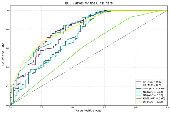 The Figure 3 below shows the ROC curve for a comparative analysis of the performance of six different classifiers. The classifiers with the highest AUC scores are as follows: decision trees (82%) AUC and gradient boosting (82%) AUC, followed by random forest (81%) AUC, logistic regression (79%) AUC, support vector machine (74%) AUC, and naïve Bayes (73%). The K-NN has the lowest (60%) AUC score. Compared to other algorithms, the 82% AUC score for the two classifiers indicates that algorithms perform better for discriminatory power when distinguishing between positive and negative cases. For support vector machine (74%) AUC and naïve Bayes (73%) AUC, this implies a good discriminatory power and offers room to improve the classifiers, which can be achieved through further hyperparameter tuning. Furthermore, though decision trees and gradient boosting have completed (82%) higher AUC scores, decision trees stood out as having a better classification when taking into account all the other evaluation metrics, such as accuracy, precision, F1 score, recall, HL, and MCC. K-NN has the least discriminatory power compared to the six other algorithms and has shown consistent sensitivity to poor data across other evaluation metrics.