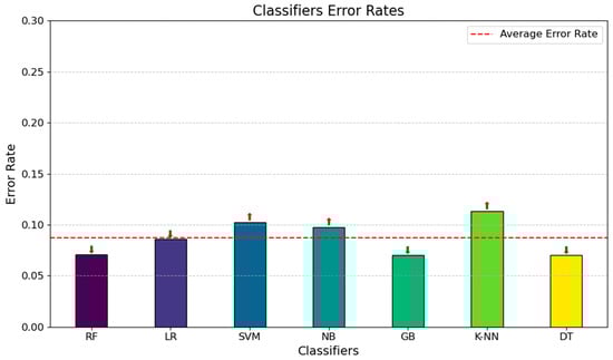 The Figure 4 below shows that the decision tree algorithm has the lowest error rate, followed by random forest, gradient boosting, and logistic regression. This low error rate implies that these four algorithms are performing well in classification and generalising well in the validation dataset, as it reveals what percentage of the class predictions are invalid. Though naïve Bayes achieved the highest accuracy from the classification report table refer to Table 2, naïve Bayes have a somewhat lower error rate, above the average 9% error rate compared to SVM and K-NN. This error rate assessment is supplemented with ROC—AUC curve metrics for comprehensive model evaluation to limit the cases of bias in the event of class imbalance. Overall, the performance of DT, RF, GB, and LR consistently show more robustness towards poor data than NB, SVM, and K-NN classifiers.