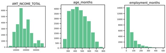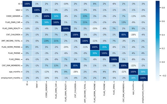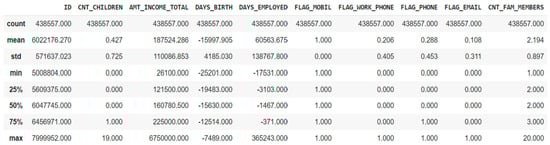 The research is based on a secondary dataset from Kaggle. This dataset is actual bank data presented on the website after removing the customers’ sensitive personal information. There are two different data files, application_record.csv and credit_record.csv. The first application_record dataset includes the applicants’ data, which may be used as predictive characteristics. The second one, the credit_record dataset, keeps track of consumers’ credit card usage habits (credit history). The ID is the connecting column (primary key) of the application and credit record datasets. Two tables that are linked by ID were combined to create the data. The application_record.csv contains the columns of the client ID, gender, ownership of a car, phone, work phone, mobile phone, email, and property, number of children, family size, annual income, income category, educational level, marital status, housing type, birthday, and occupation type. Client ID, record month, and customer status are the columns in the credit_record.csv dataset. As a starting point, the record month is the month from which the data were collected; counting backward, 0 represents the current month, −1 represents the prior month, and so on. The status column lists the following amounts as past due: 0: 1–29 days, 1: 30–59 days, 2: 60–89 days, 3: 90–119 days, 4: 120–149 days, 5: write-offs for greater than 150 days that are past-due or bad debts. “C” indicates that month’s repayment, and “X” indicates no loan for the month. Detailed descriptions of the variables are given in Appendix A.