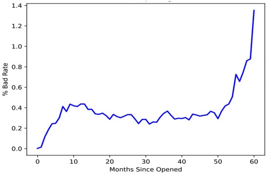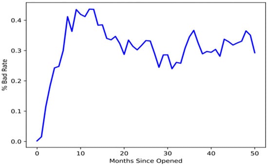 Over the course of all account-opening months, the bad rate ratio needs to be computed for the entire portfolio to locate the stable period of the bad rate. In the beginning, there was only a modest increase in the number of credit cards; however, this may have been insignificant for the models. Figure 4 shows that accounts that have been open for more than 50 months demonstrate a dramatic increase in the percentage of bad loans.
