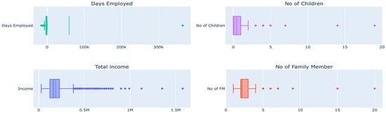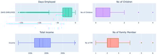 Outliers can affect the quality of the research since all statistical data are susceptible to their effects, including means, standard deviations, and all other statistical inferences based on them. Handling outliers is one of the essential steps in data pre-processing. According to Figure 7 below, there are outliers that need to be removed from the data regarding days employed, total income, count of children, and count of family members.
