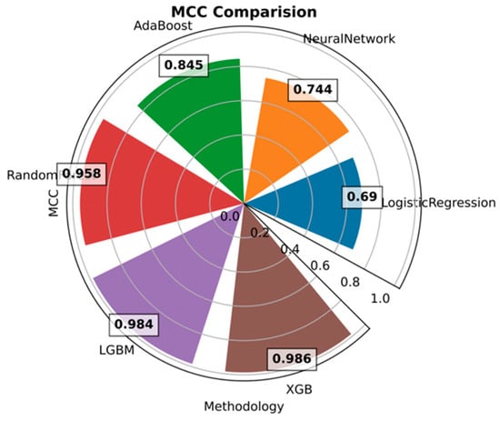 MCC is the best single-value classification metric, which serves to summarize the confusion matrix or an error matrix. As per Figure 26, the model XGB outperforms the other algorithms with a score of 0.9879, followed by LGBM (0.986).