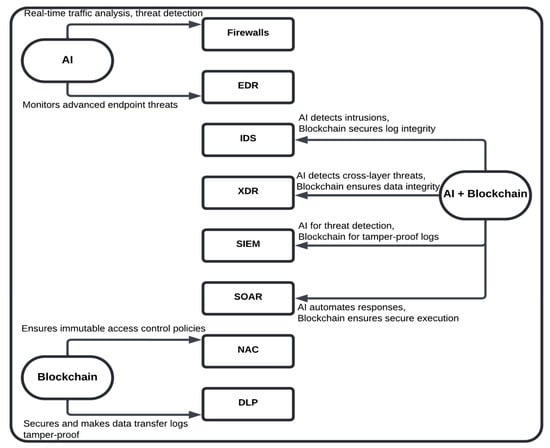 While AI significantly strengthens the detection and response capabilities of these security systems, integrating blockchain adds further robustness. Blockchain’s decentralized and immutable ledger ensures that event logs from systems like SIEM and IDS are stored securely and cannot be altered, providing an additional layer of trust and integrity. Smart contracts within blockchain can automate security responses in SOAR or XDR platforms, executing predefined actions when AI detects threats. This combination ensures transparency, accountability, and verifiability in AI-driven security decisions. Together, AI and blockchain create a more resilient cybersecurity framework, addressing modern threats while ensuring compliance, governance, and data integrity in critical organizational environments (Taherdoost 2022).