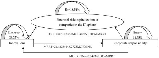 Regression relationships (2)–(4) are unified in the SEM model. Indicator FR in Equation (1) is the measurement of financial losses. To measure risk, this indicator of financial losses is supplemented in the SEM model by the coefficient of variation as the indicator of index volatility. Due to this, a design that is based on SEM in Equations (1)–(4), compared to a design that is based on regressions of the change in the profitability of IT on the profitability of MRRT in connection with the profitability of the MOEXINN, allows for the most complete, precise, and correct measuring of the financial risk for companies, for in the SEM model, financial losses (profitability) are supplemented with the coefficient of variation (uncertainty).