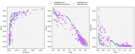 Figure 2 compares the solutions found for problems (7) and (9). Purple points correspond to (7) and were calculated using SciPy (Virtanen et al. 2020). Green points correspond to (9) and were calculated using D-Wave’s Ocean package for Python, where a simulated annealing algorithm is available, in the form of the function “neal”. The parameters we used for DWave’s neal function were annealingSamples = 200 and annealingTime = 100. Each point (for each color, respectively) is obtained by using a different weight vector . The resolution used in the discretization was and the penalty factor for the linear equality constrained was .