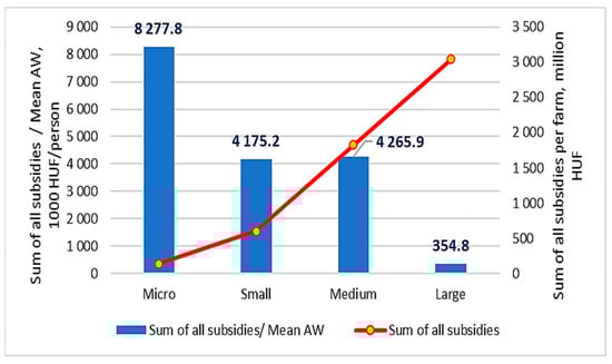 The proportion of subsidized farms differed by size category. According to the size categories in 2021, 690 (micro enterprises (65.5% of the 1053) received subsidies, and 246 small enterprises (93.2% of the 264) and 49 medium-sized ones (86.0% of the 57) were also subsidized. The number of large enterprises varied between four (in 2014) and two (in 2021) during the analyzed period, but they all received subsidies during the 2014–2021 period.