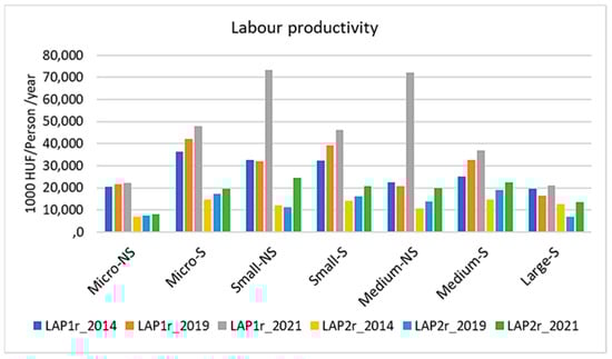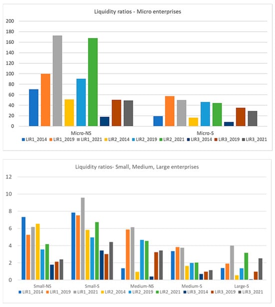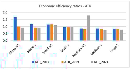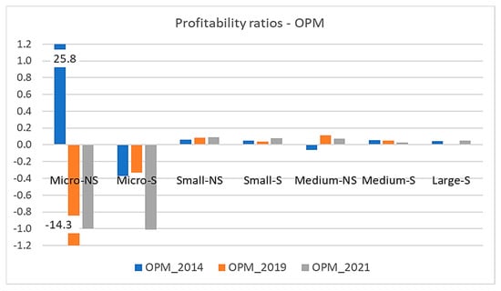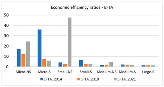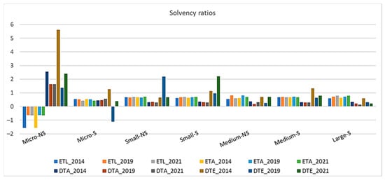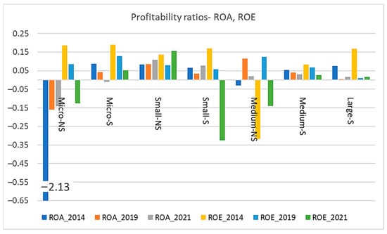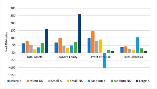 Figure 3 shows the change in these financial indicators, from 2014 to 2021, as a percentage of the 2014 value. Most of the changes were positive, except profit after tax in medium-sized enterprises.
