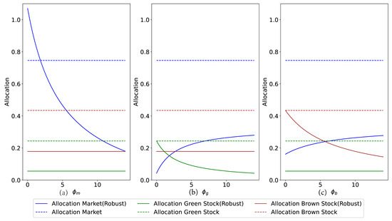 - Thirdly, we explore a scenario in which an investor excludes the brown asset from its portfolio. This type of investor actively avoids exposure to the brown risk and focuses solely on investing in the market index and the green asset. However, they rigorously address the robust portfolio optimization problem in line with their specific risk preferences and ambiguity aversions. Given , the suboptimal strategy isWe categorize this type of investor as a ‘selectively brown-avoidant investor’ and denote the associated value function as .