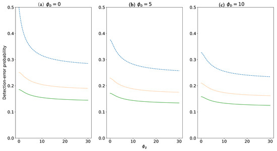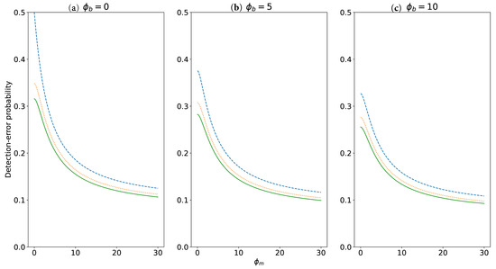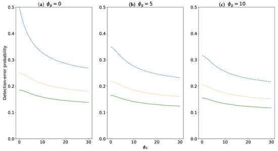 We also observe that exerts the most substantial influence on the detection error probability. Figure A2 shows that increases in have the greatest impact on the detection error probability, and Figure A2 exhibits a more pronounced curvature than Figure A3 and Figure A4.