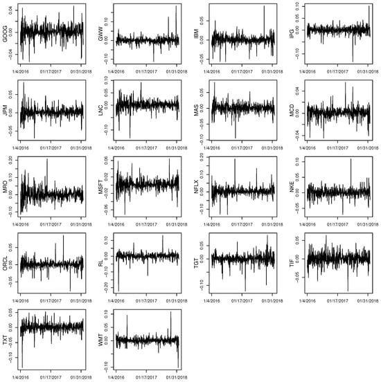 The proposed framework can be viewed as an extension of the literature on regularization techniques for converting high-dimensional linear models to nonlinear time series models. Since () introduced LASSO for linear regression models, various regularization techniques concerning high-dimensional statistical inference have been studied for various problems in linear models. For example, () proposed the smoothly clipped absolute deviation (SCAD) penalty that generates sparse estimation of regression coefficients with reduced bias and explored the so-called “oracle property”, in which the estimator has asymptotic properties that are equivalent to the maximum likelihood estimator in the non-penalized model. () proposed adaptive LASSO by adding adaptive weights for different parameters in the penalty to obtain better estimator performance. () proposed a group LASSO penalty to solve the problem of selecting grouped factors in regression models. () proposed a minimax concave penalty that gives nearly unbiased variable selection in linear regression. In addition to discussions on regularized estimation in high-dimensional statistics, which relies primarily on independent and identically distributed (i.i.d.) samples and linear models, regularization techniques have also been applied to study inference problems in high-dimensional linear time-series models. For instance, () studied a class of penalty functions and showed the oracle properties for the estimators in high-dimensional vector autoregressive (VAR) models. () investigated the theoretical properties of -regularized estimates in high-dimensional stochastic regressions with serially correlated errors and transition matrix estimation in high-dimensional VAR models. () developed a regularization framework for full-factor MGARCH models (), in which the dynamics of covariance matrices are determined by the dynamics of univariate GARCH processes for orthogonal factors. Using the group LASSO technique, () studied the inference problem for MGARCH models with vine structure, an alternative to dynamic conditional correlation MGARCH models.
