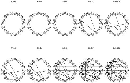 In this section, we study the performance of the regularized BEKK models on some simulated examples. Consider Model (3) with and . Note that we then have parameters, as matrix C is lower triangular. We assume that the parameter matrices satisfy the stationary condition, Condition 2, and, for identification purposes, we assume that the diagonal elements in C are positive, , and . We consider two cases for matrices A, B, and C, which are summarized in Table 1. In both cases, the indices of nonzero elements in coefficient matrices A, B, and C are randomly generated. To ensure that the matrices satisfy Condition 1, values of the diagonal elements in A and B are randomly generated from a uniform distribution on U, and the off-diagonal nonzero elements in A and B are generated from U. All the nonzero elements in C are generated from U.