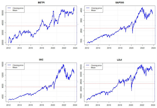 The evolution of the daily closing prices of the BET-FI, S&P 500, IXIC, and DJIA indices.
